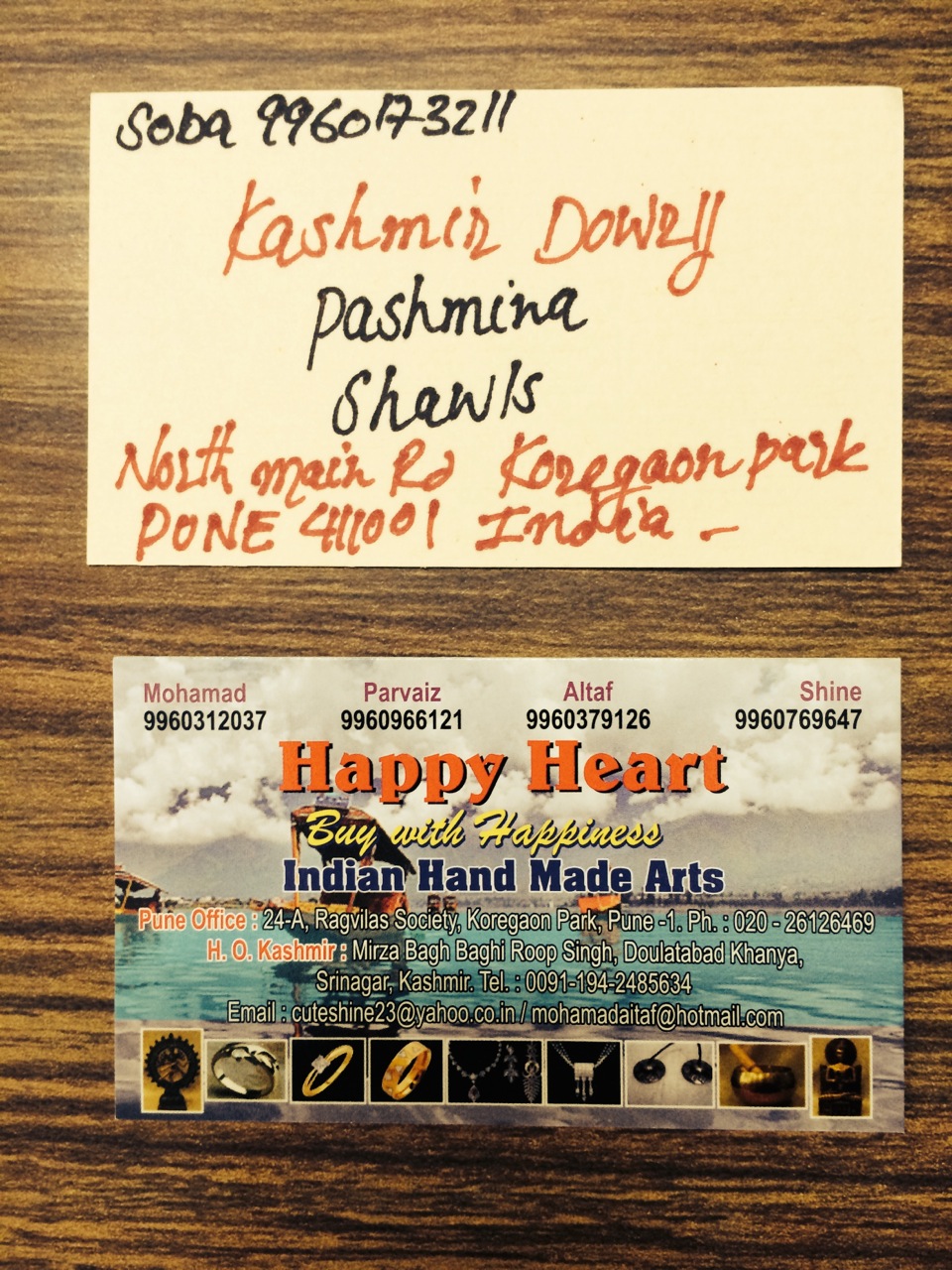In India, makeshift buildings might contain great little shops. In Koregaon Park, we stopped at a trio of hole-in-the-wall shops with a vast selection of silver jewelry (Happy Heart), genuine pashmina shawls (Kashmir Dowry), and handmade silk clothing (I don’t know the name). The pashmina proprietor, Soba, from Kashmir, carries an endless selection of handwoven 100% pashmina shawls and also collectible pieces like kani shawls, which take several months to weave.