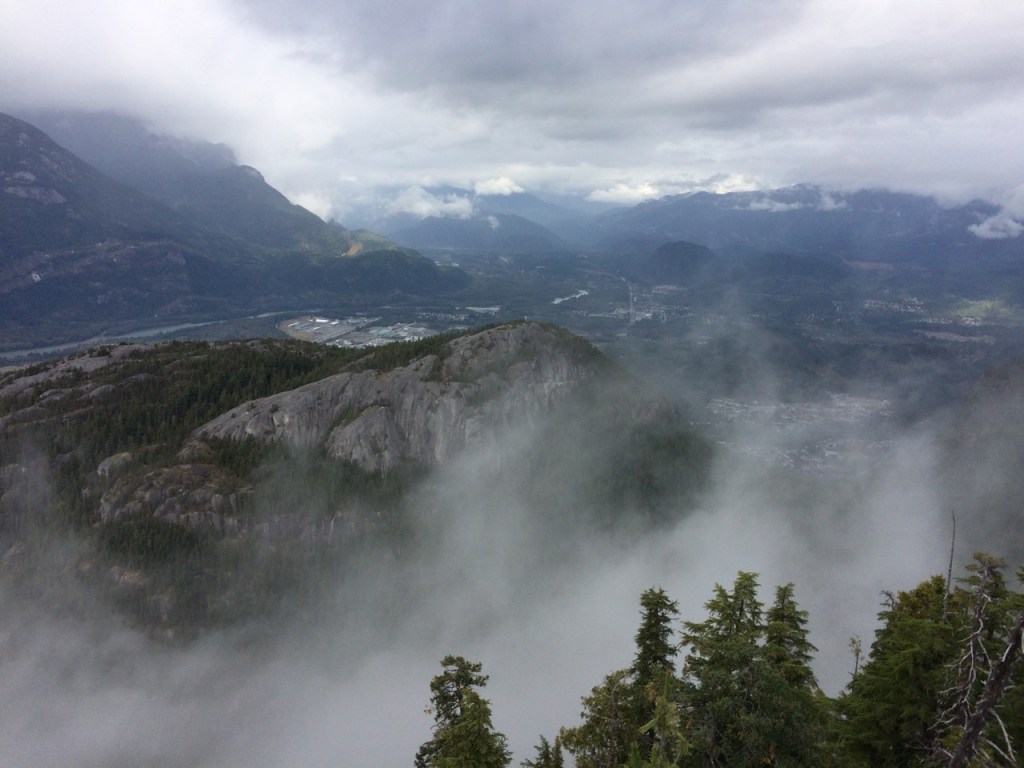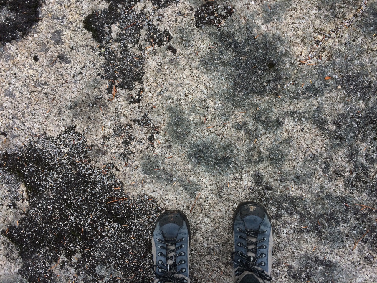 Images: mossy forest near Shannon Falls; Stawamus Chief sign; back face of the Chief; hiking shoes on granite