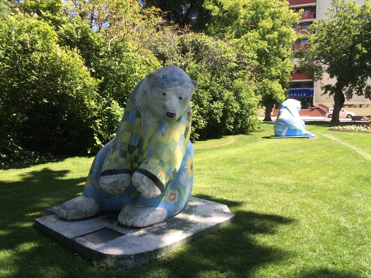 Images: “Bears on Broadway” is public art featuring seven-foot-tall polar bear sculptures in Winnipeg. Established in 2005, it originally comprised more than 60 bears; today most are privately owned, but about 20 remain in public display. I chanced upon “Nanookshuk” and a few individual bears in June 2015.